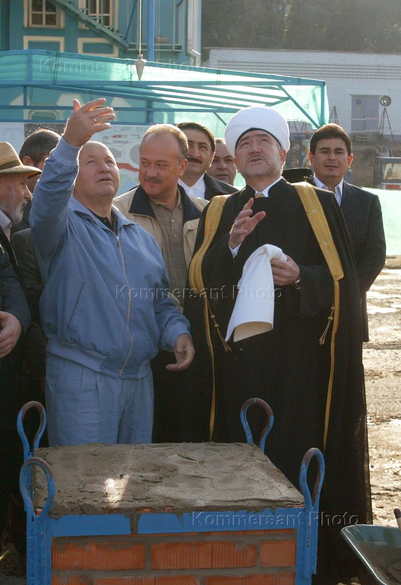 Председатель Совета муфтиев России шейх Равиль Гайнутдин (слева) и мэр Москвы Юрий Лужков (в центре) на торжественной церемонии закладки первого камня в основание нового комплекса Московской соборной мечети.