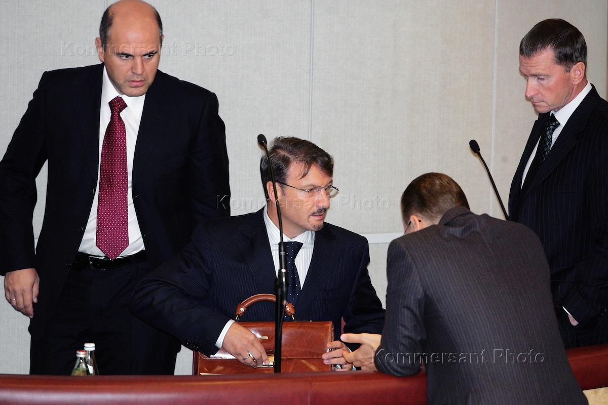 Russian Economic Development and Commerce Minister German Gref, sitting 2nd right, and Chairman of the Russian State Duma Credit Institutions and Financial Markets Committee Vladislav Reznik, right, attend a Duma session.