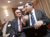 Экономист, научный руководитель Государственного Университета "Высшая школа экономики" Евгений Ясин (слева) и секретарь президиума политсовета "Союз правых сил" (СПС) Борис Надеждин (справа) на Международной конференции "Российские выборы в контексте международных избирательных стандартов". Конференция прошла в гостинице "Националь".