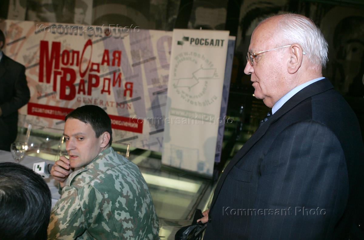 Лидер движения "Авангард красной молодежи" (АКМ) Сергей Удальцов (слева) и Первый Президент СССР, лидер Российской объединенной Социал-демократической партии России Михаил Горбачев (справа) перед началом заседания молодежного дискуссионного клуба "Молодая гвардия - New Generation". Заседание прошло в гостинице "Молодежная".