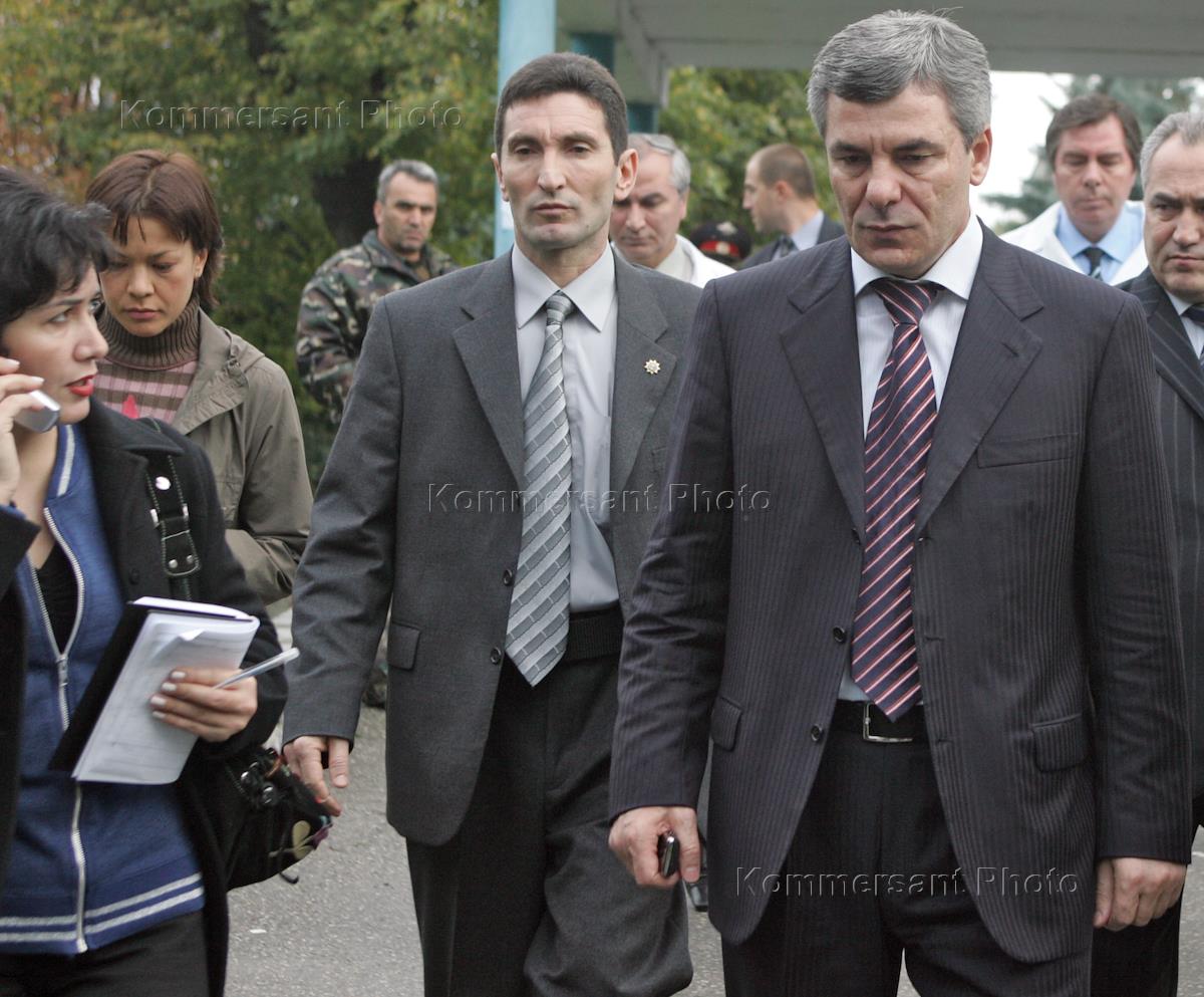 Министр внутренних дел Кабардино-Балкарии Хачим Шогенов (сидит) и заместитель министра внутренних дел России Андрей Новиков (стоит) на пресс-конференции, посвященной текущей ситуации в Нальчике. В четверг 13 октября в столице Кабардино-Балкарии экстремисты предприняли попытку захвата здания ФСБ, МВД и ряда городских отделов милиции. Две мобильные группы боевиков обстреляли здания из гранатометов и стрелкового оружия. Атака была отбита, нападавшие рассеяны. В результате операции был уничтожен 91 боевик, еще 36 бандитов задержаны по подозрению в причастности к нападению. В боях на улицах города погибли 24 сотрудника правоохранительных органов. Есть жертвы среди мирного населения.
