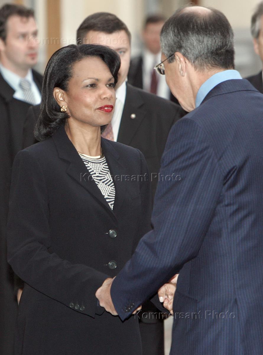 US Secretary of State Condoleezza Rice, right, and Russian Foreign Minister Sergey Lavrov, left, are shown before talks held in the Russian Foreign Ministry office.