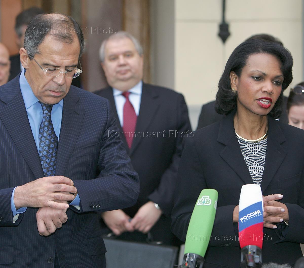 Госсекретарь США Кондолиза Райс (слева) и министр иностранных дел России Сергей Лавров (справа) перед началом переговоров, которые прошли в особняке МИДа.