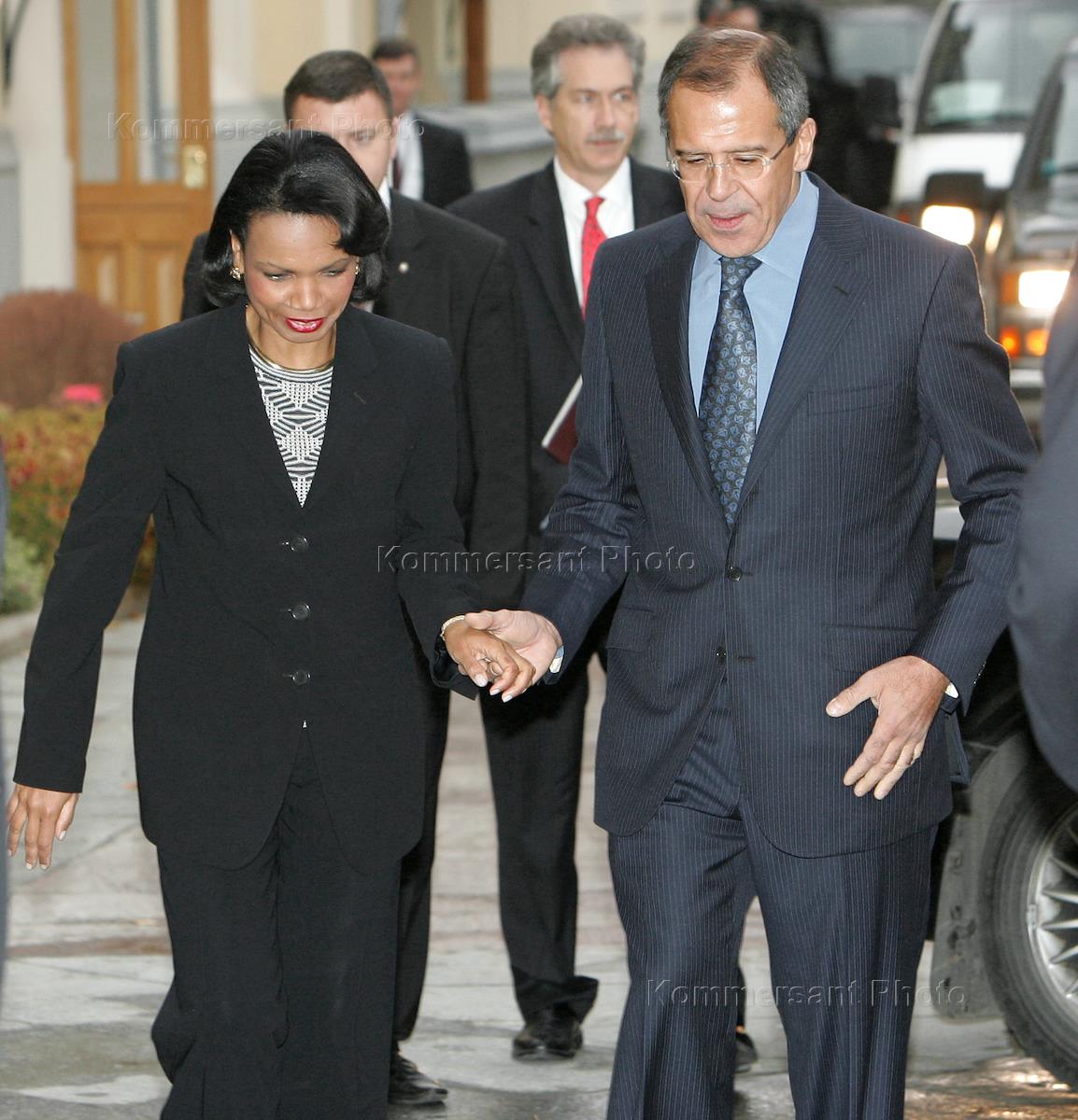 Госсекретарь США Кондолиза Райс (слева) и министр иностранных дел России Сергей Лавров (справа) перед началом переговоров, которые прошли в особняке МИДа.