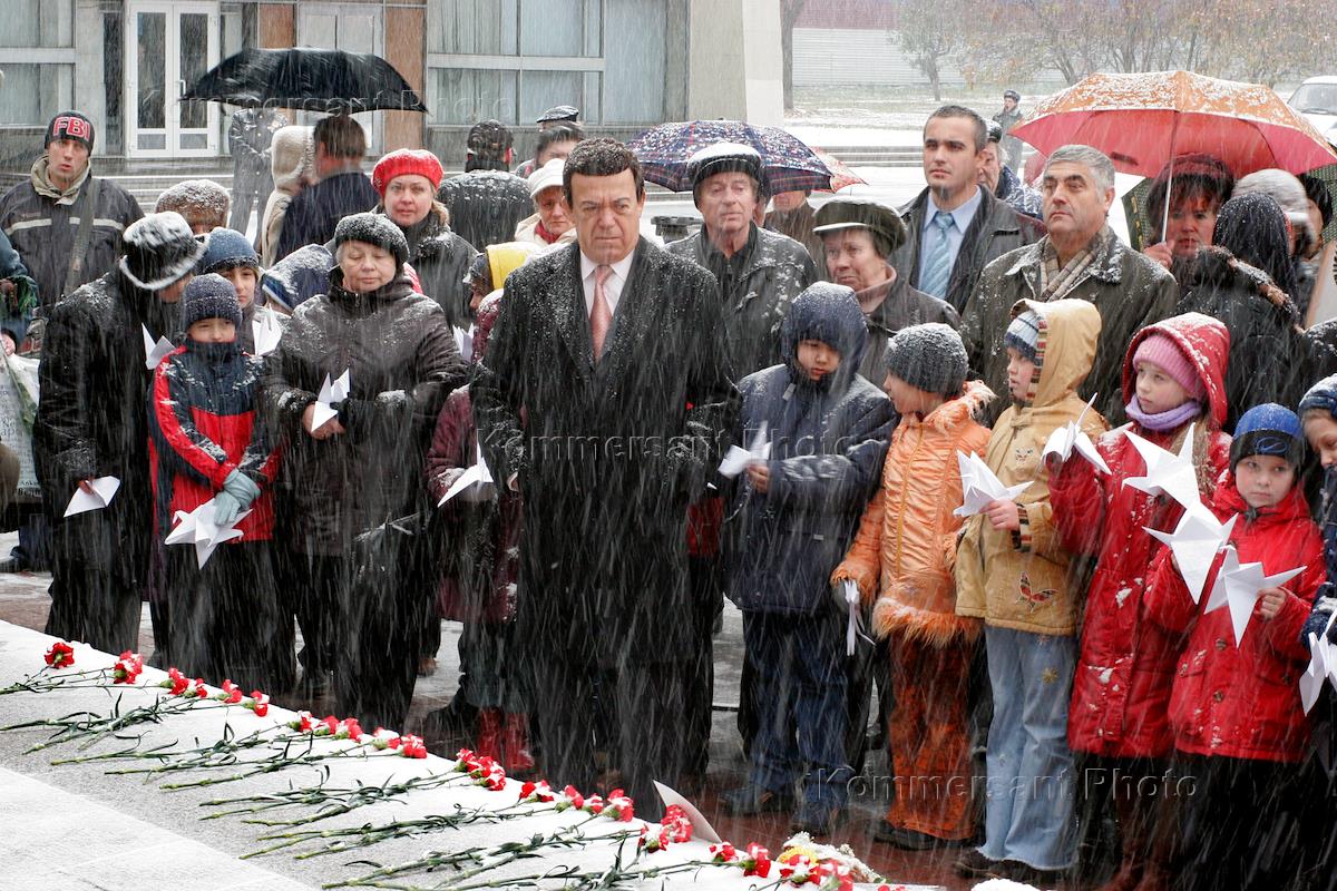 Председатель комитета Государственной Думы России по культуре, певец Иосиф Кобзон (в центре) на панихиде по жертвам теракта 23 октября 2002 в Театральным центром на Дубровке, в котором шла демонстрация мюзикла "Норд-Ост". Панихида состоялась на площади перед Театральным центром.