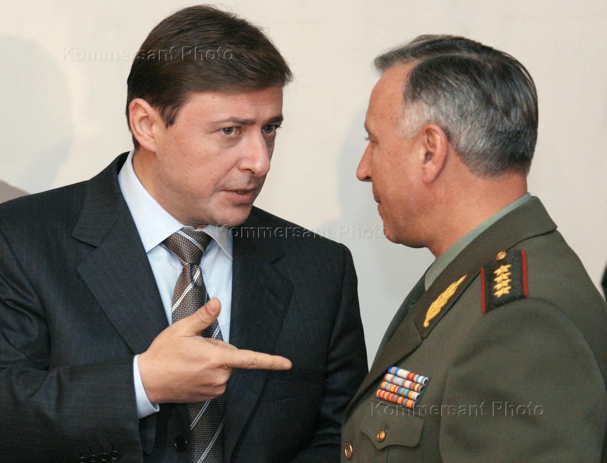 Президент Республики Бурятия Леонид Потапов во время окружного совещания "О ходе исполнения бюджетов 2005 года субъектами России Сибирского Федерального округа, формирование межбюджетных отношений в 2006 году в условиях реформы местного самоуправления" с участием Министра финансов России Алексея Кудрина (слева). Совещание прошло в Читинском областном театре.