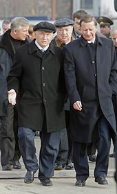Мэр Москвы Юрий Лужков (слева) и министр обороны России Сергей Иванов (справа) на церемонии закладки памятной капсулы в основание строящегося Ледового дворца на Хорошевском шоссе.
