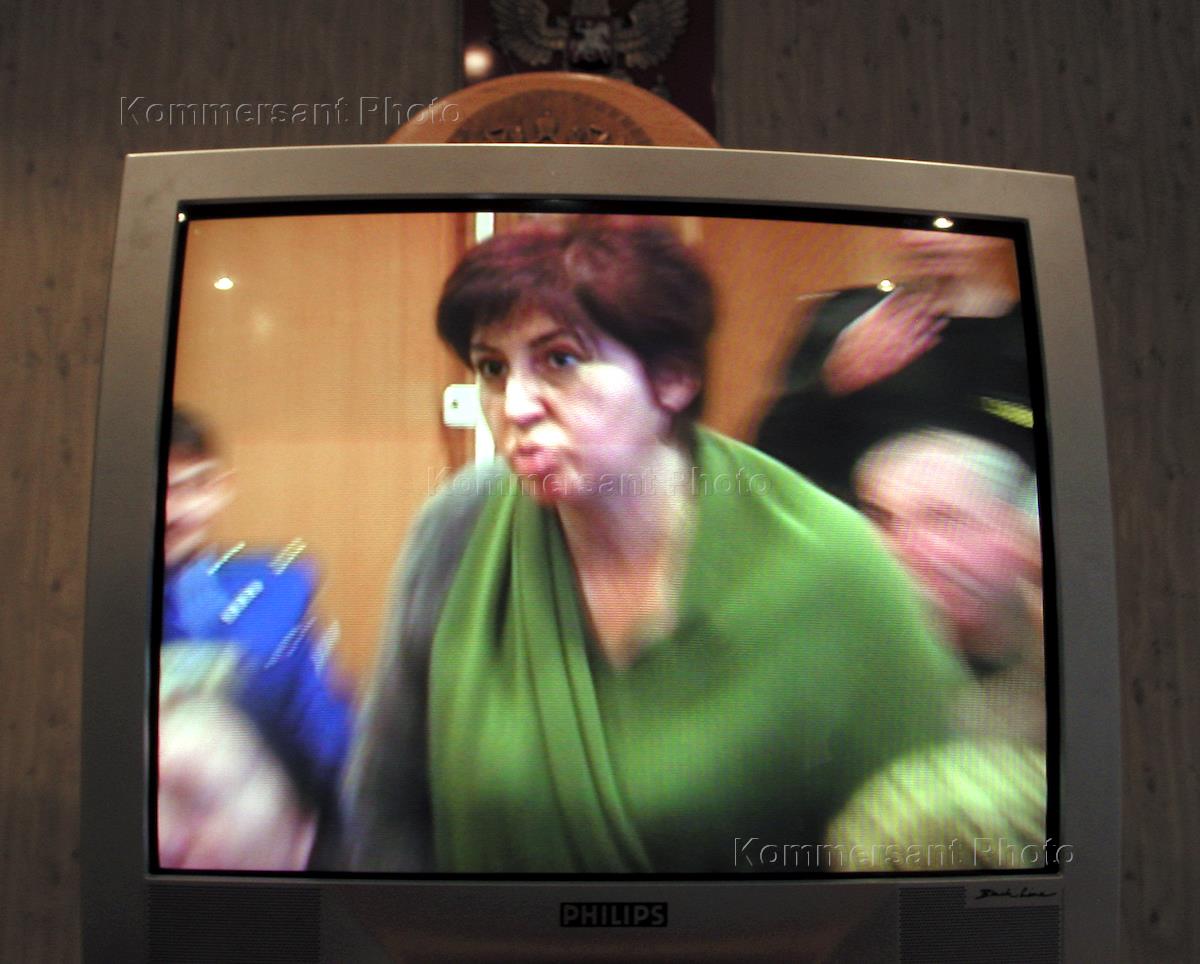 Свидетельница Элла Кесаева (на экране монитора) на заседании Верховного суда Северной Осетии по делу единственного оставшегося в живых участника захвата первой бесланской школы Нурпаши Кулаева.