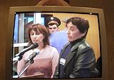 Свидетельница (справа на экране монитора) на заседании Верховного суда Северной Осетии по делу единственного оставшегося в живых участника захвата первой бесланской школы Нурпаши Кулаева.