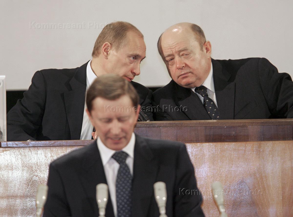 Президент России Владимир Путин (слева), председатель Правительства России Михаил Фрадков (в центре) и председатель Совета Федерации Сергей Миронов (справа) во время сбора руководящего состава Вооруженных сил России в Министерстве обороны России.