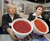 Международная рыбопромышленная выставка "РЫБПРОМ - ЭКСПО 2005" прошла во Всероссийском выставочном центре (ВВЦ). Ведра с красной икрой.