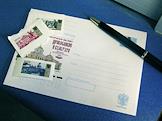 Конверт, авторучка и марки лежат на столе.