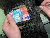 Бумажник с пластиковой карточкой учащегося и пятирублевая монета.