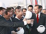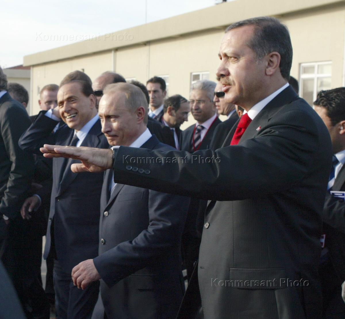 Президент России Владимир Путин (второй слева), премьер-министр Турции Реджеп Эрдоган (третий справа) и премьер-министр Италии Сильвио Берлускони (слева) на официальной церемонии открытия газопровода "Голубой поток".
