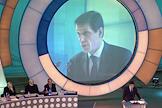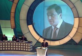 Председатель Государственной Думы России Борис Грызлов (на экране) на VI съезде партии "Единая Россия", который прошел в Красноярске.