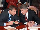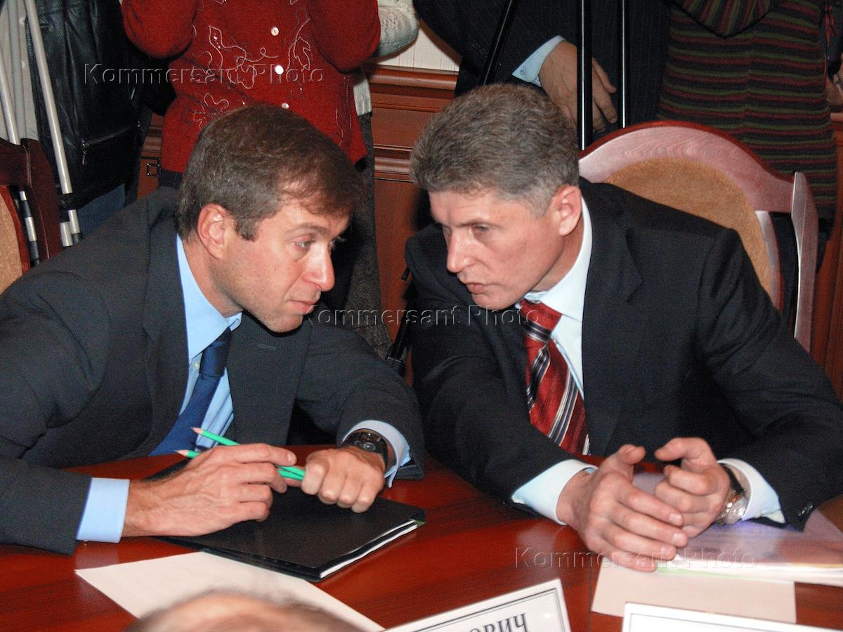 Губернатор Чукотского автономного округа Роман Абрамович (слева) и губернатор Корякского автономного округа /КАО/ Олег Кожемяко (справа) на первом заседании полномочного представителя Президента России в Дальневосточном федеральном округе Камиля Исхакова с губернаторами.