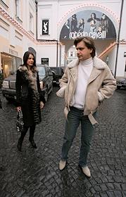 Мужчина и девушка выходят с покупками из бутика фирмы "Tod's" на улице бутиков и дорогих магазинов в Третьяковском проезде.