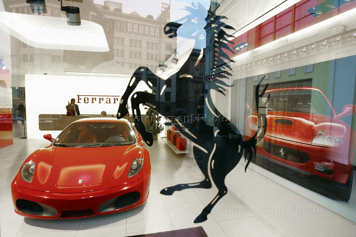 Витрина салона Ferrari / Maserati на улице бутиков и дорогих магазинов в Третьяковском проезде.