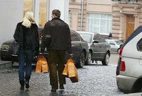 Покупатели с пакетами на улице бутиков и дорогих магазинов в Третьяковском проезде.
