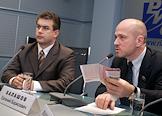 Депутат Московской городской думы Евгений Балашов (в центре) и член политической партии "Родина" Владислав Яшкин (слева) на пресс-конференции "Использование административного ресурса и возможные фальсификации на выборах в Мосгордуму". Пресс-конференция прошла в РИА "Новости".