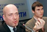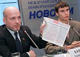 Депутат Московской городской думы Евгений Балашов (слева) и руководитель союза молодежи "За Родину!" Сергей Шаргунов (справа) на пресс-конференции "Использование административного ресурса и возможные фальсификации на выборах в Мосгордуму". Пресс-конференция прошла в РИА "Новости".