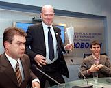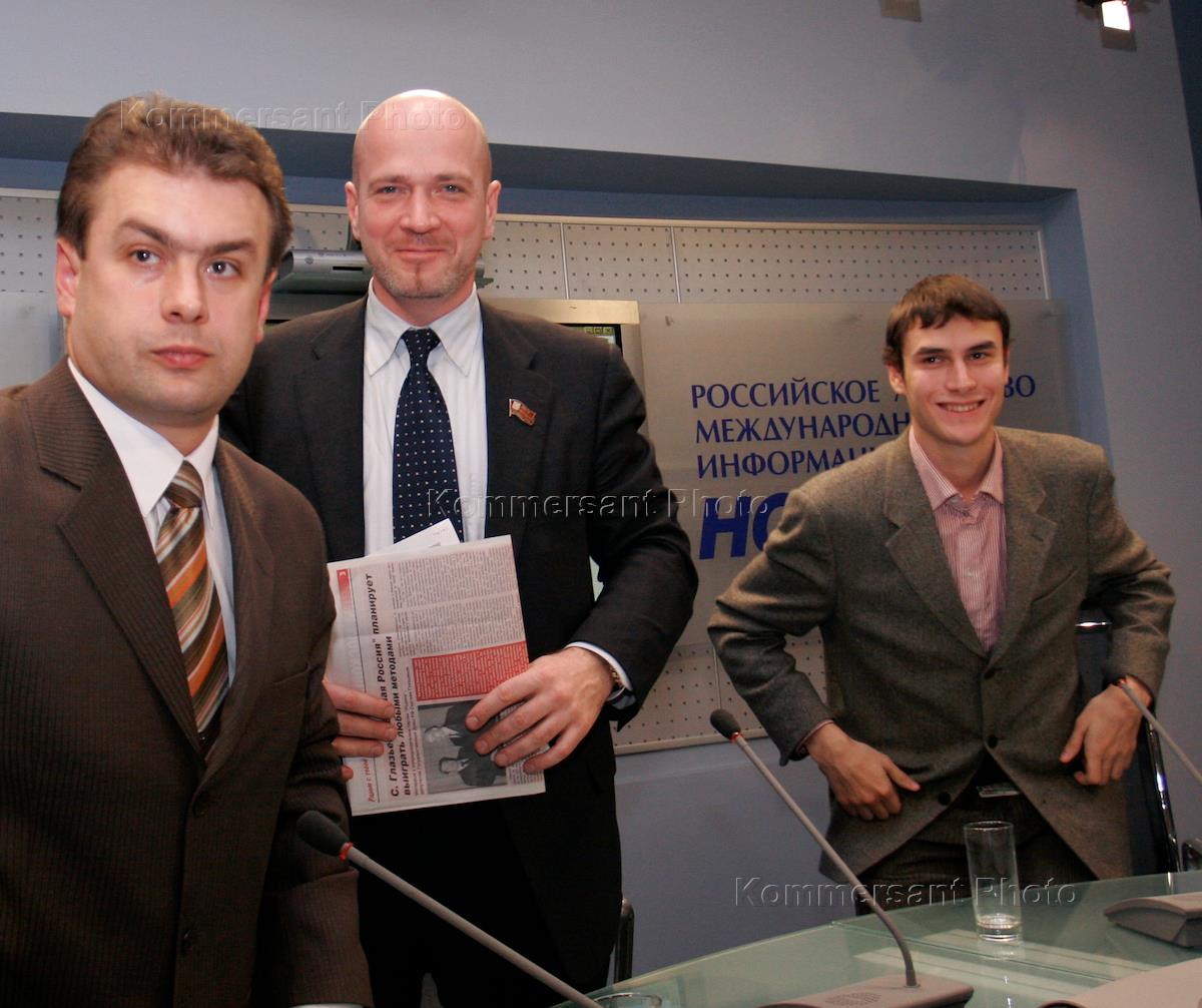 Депутат Московской городской думы Евгений Балашов (в центре), член политической партии "Родина" Владислав Яшкин (слева) и руководитель союза молодежи "За Родину!" Сергей Шаргунов (справа) на пресс-конференции "Использование административного ресурса и возможные фальсификации на выборах в Мосгордуму". Пресс-конференция прошла в РИА "Новости".