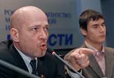 Член политической партии "Родина" Владислав Яшкин (слева) на пресс-конференции "Использование административного ресурса и возможные фальсификации на выборах в Мосгордуму". Пресс-конференция прошла в РИА "Новости".