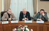 Депутат Московской городской думы, координатор фонда "Культура и искусство" Евгений Бунимович (слева), секретарь Московского регионального политсовета Всероссийской политической партии "Единая Россия" Юрий Карабасов (в центре) и руководитель юридической службы ЦК КПРФ Вадим Соловьев (справа) на пресс-конференции по итогам выборов в Мосгордуму. Пресс-конференция прошла в Мосгоризбиркоме.