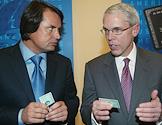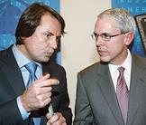 Председатель Совета директоров компании "РУСТ" Рустам Тарико (слева) и старший вице-президент, финансовый директор компании "American Express Global Network Services" Гарри Криттенден (справа) во время пресс-конференции, на которой банк "Русский Стандарт" и "American Express" объявили о выпуске первых карт "American Express" в России. Пресс-конференция прошла в гостинице "Арарат Парк Хаятт".