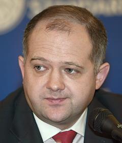 Исполняющий обязанности председателя правления "Банка Русский Стандарт" Дмитрий Левин во время пресс-конференции, на которой банк "Русский Стандарт" и компания "American Express" объявили о выпуске первых карт "American Express" в России. Пресс-конференция прошла в гостинице "Арарат Парк Хаятт".