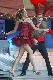 Участники телепроекта "Дом 2" Алена Водонаева (слева) и Степан Меньщиков (справа) во время выступления на концерте "Звезды "Дома - 2" поют!" в спорткомплексе "Олимпийский".