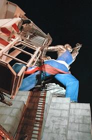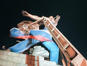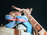 The action to save the monument by Vera Mukhina 'Worker and Kolkoznitsa'. The monument is being dressed in the white, blue and red clothes (colours of the flag of the Russian Federation). The costume symbolizes the need of the immediate restoration.