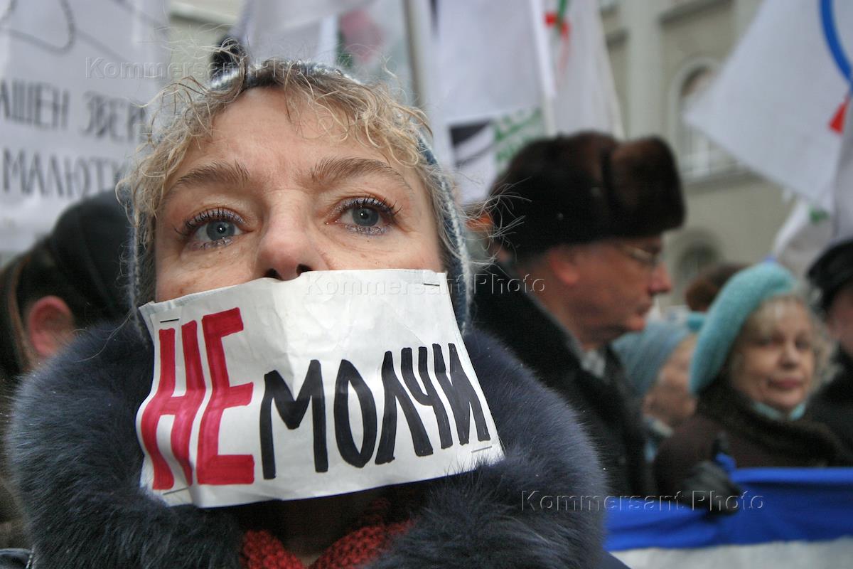 Участница "Антифашистского марша" с повязкой на лице с надписью "Не молчи!". Марш прошел от станции метро "Чистые пруды" по улицам Мясницкая и Лубянка до Соловецкого камня.