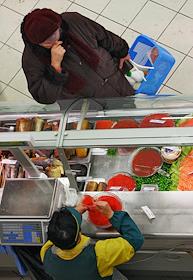 Торговый зал супермаркета "Перекресток". Покупательница у прилавка рыбного отдела.