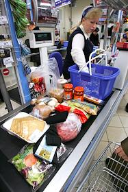 Покупательница с тележкой покупает продукты в супермаркете "Перекресток" на Тишинской площади.