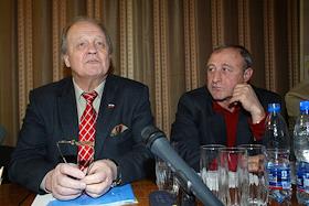 директор "Росгосцирка", дрессировщик Мстислав Запашный (слева) и директор Центра циркового искусства Дмитрий Саетович (в центре) во время пресс-конференции на тему: "Российский цирк в новых условиях", посвященной реформе российского государственного цирка, новым номерам и программам, разработанным в ЦЦИ "Росгосцирка". Пресс-конференция прошла в Центре цирковых искусств.