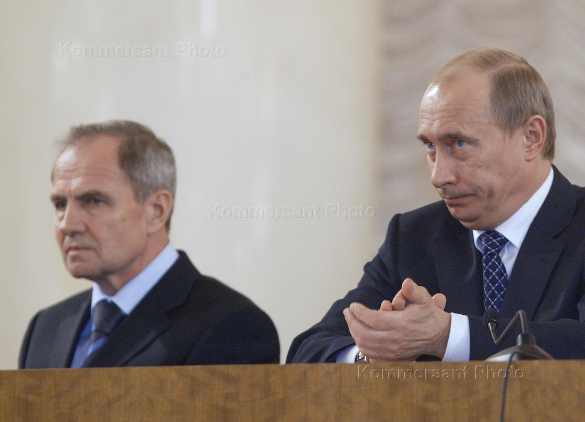 Председатель Конституционного суда России Валерий Зорькин (слева) и Президент России Владимир Путин (справа) на учредительном съезде Ассоциации юристов России. Съезд прошел в Овальном зале Дома Союзов.