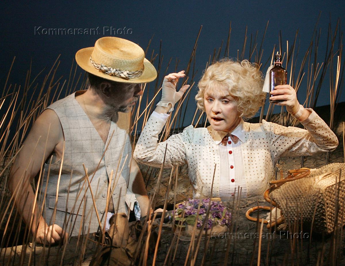 Премьера спектакля "Счастливые дни" по пьесе Сэмюэля Беккета (Beckett) в постановке режиссера Михаила Бычкова прошла на сцене филиала Московского драматического театра имени А.С.Пушкина. Актриса Вера Алентова в роли Винни (справа) и актер Юрий Румянцев в роли Вилли (слева).