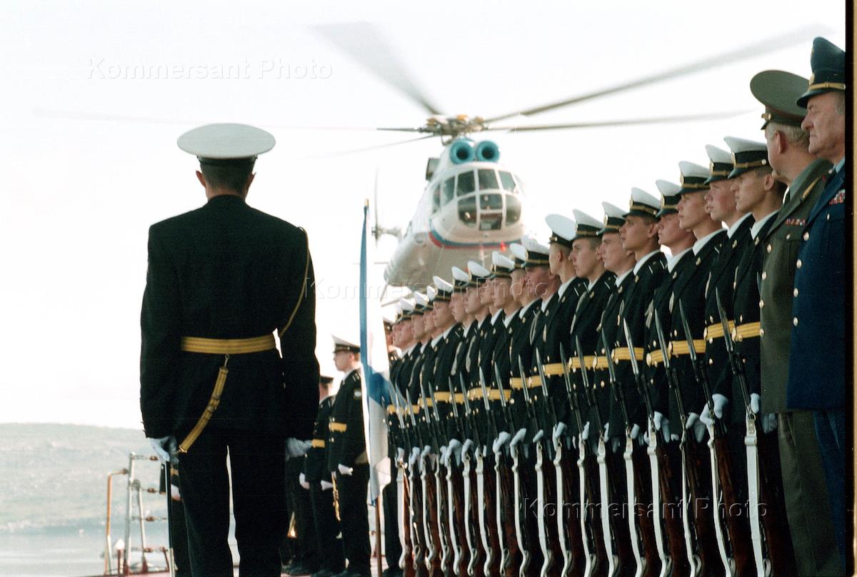 Секретарь совета безопасности России Андрей Кокошин (лицом) и командование авианесущего крейсера "Петр Великий" провожают вертолет Президента России Бориса Ельцина. Снимок сделан во время посещения Президентом военных учений на Северном флоте.