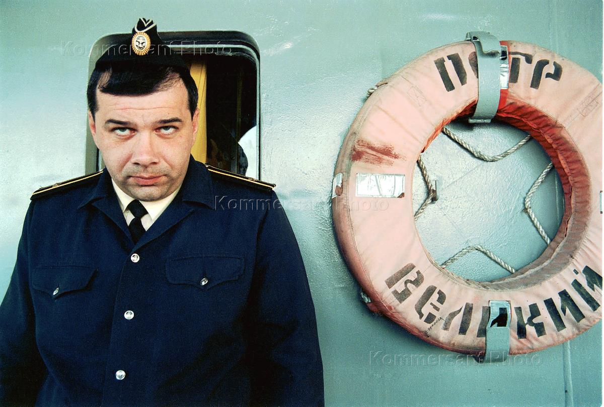 Секретарь совета безопасности России Андрей Кокошин (лицом) и командование авианесущего крейсера "Петр Великий" провожают вертолет Президента России Бориса Ельцина. Снимок сделан во время посещения Президентом военных учений на Северном флоте.
