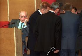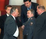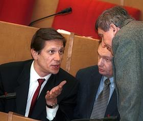 Член депутатской группы "Регионы России" (Союз независимых депутатов), председатель Комитета Госдумы по бюджету и налогам Александр Жуков (слева), первый заместитель министра по делам печати, телерадиовещания и средств массовых коммуникаций Михаил Сеславинский (в центре) и член фракции "Союз Правых Сил", заместитель председателя Комитета Госдумы по безопасности Сергей Юшенков (справа) на пленарном заседании Государственной Думы, во время которого среди других рассматривалась поправка закона "О рекламе" /в части рекламы в радио и телепрограммах. ограничения на рекламу алкогольной продукции, табака и табачных изделий/.