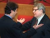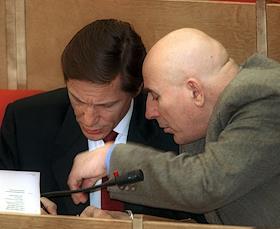 Первый заместитель руководителя фракции "Яблоко", член Комитета Госдумы по информационной политике Сергей Иваненко (слева) и член фракции "Отечество - Вся Россия", заместитель председателя Комитета Госдумы по бюджету и налогам Геннадий Кулик (справа) на пленарном заседании Государственной Думы, во время которого среди других рассматривалась поправка закона "О рекламе" /в части рекламы в радио и телепрограммах. ограничения на рекламу алкогольной продукции, табака и табачных изделий/.