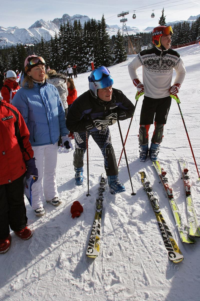 Русский Новый год в Куршевеле. Директор Спортивного клуба "Новая Лига" Олег Карпов (в центре) на соревнованиях на "Кубок миллионеров по горным лыжам" (слалом) на горнолыжном курорте "Три долины" в олимпийской деревне Куршевель.