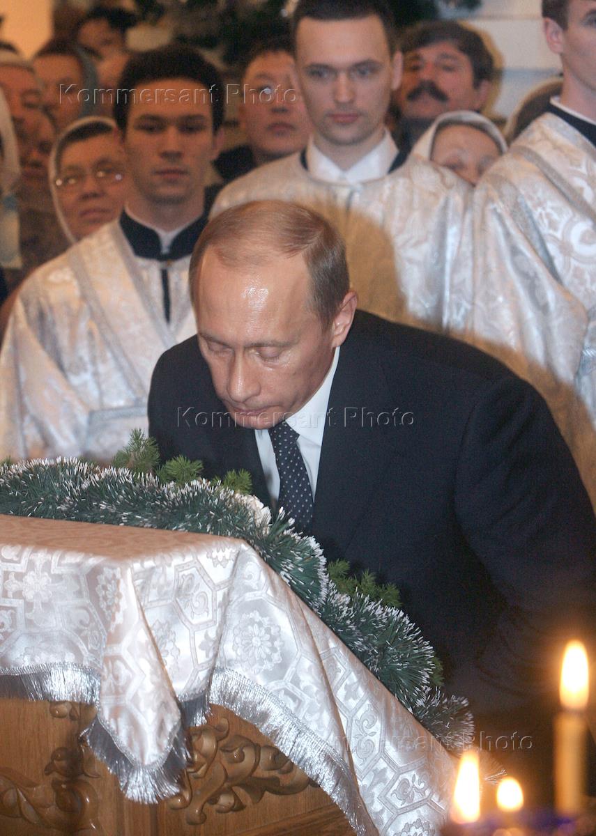 Президент России Владимир Путин на Рождественской службе в Преображенском соборе.