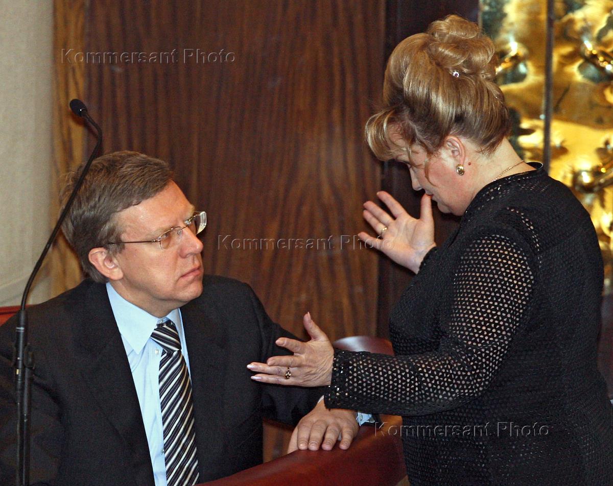 Russian Finance Minister Aleksey Kudrin, left, and Deputy Speaker of the Russian State Duma Lyubov Sliska, right, attend the State Duma 1st spring session.