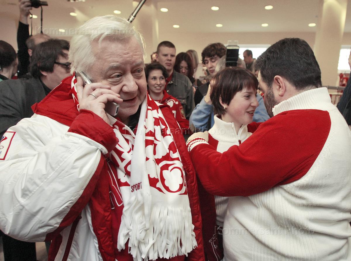 Art director of the Chekhov Moscow Art Theatre (MKT) Oleg Tabakov, left, figure skater Irina Slutskaya, centre, and Bosco di Ciliegi Russia CEO Mikhail Kusnirovich, right, attend an open day in Bosco di Ciliegi Olympic centre.