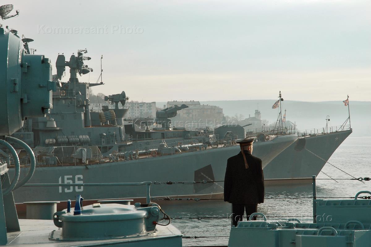 Commander of the surface ships division of the Russian Black Sea Fleet, rear admiral Oleg Garamov, centre, is shown at missile cruiser Moskva.