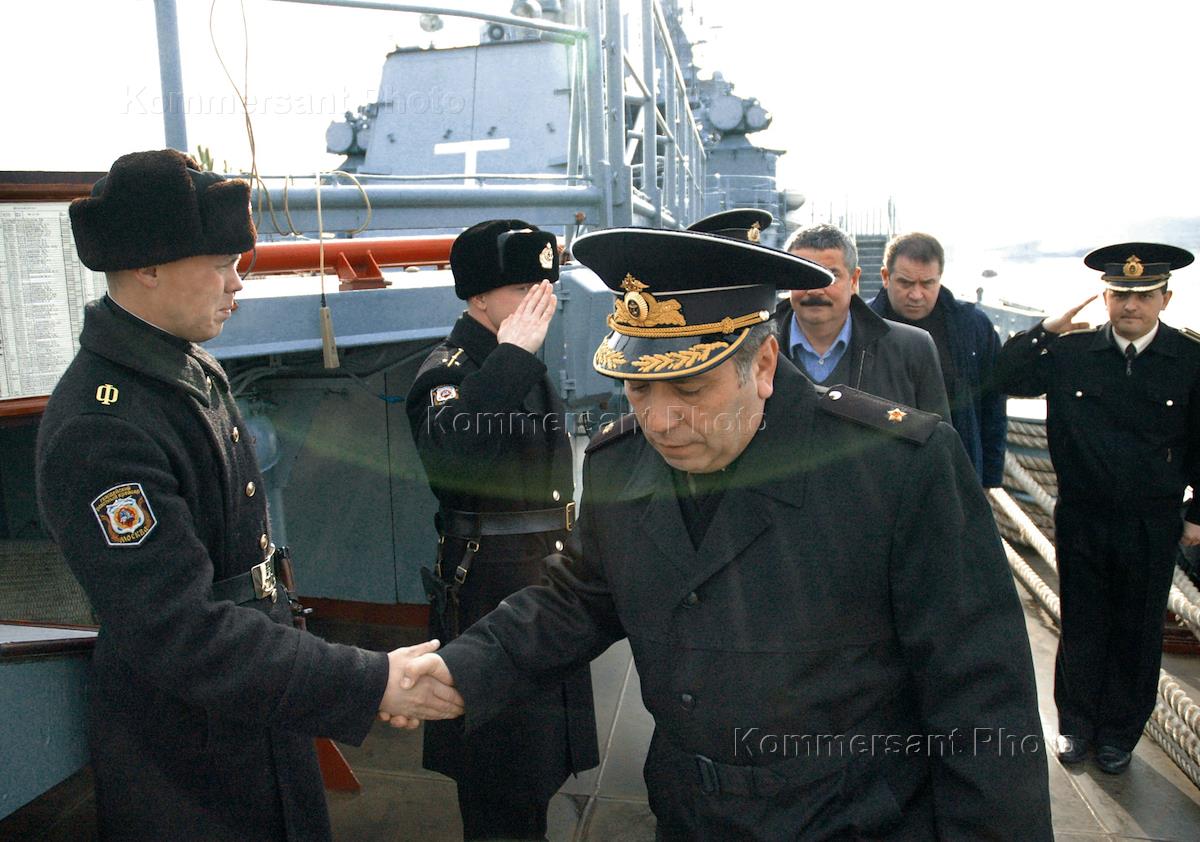 Commander of the surface ships division of the Russian Black Sea Fleet, rear admiral Oleg Garamov, centre, is shown at missile cruiser Moskva.