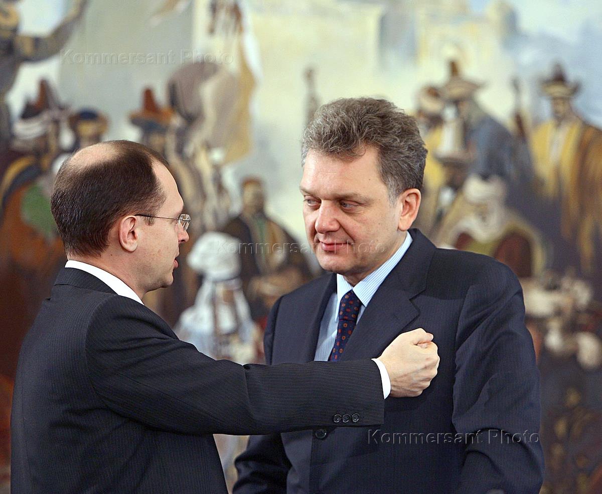 Head of the Russian Federal Atomic Energy Agency Sergey Kiriyenko, left, and Russian Industry and Energy Minister Viktor Khristenko, right, are shown during a meeting of Presidents of Russia and Kazakhstan Vladimir Putin and Nursultan Nazarbayev. The presidents discussed bilateral ties.