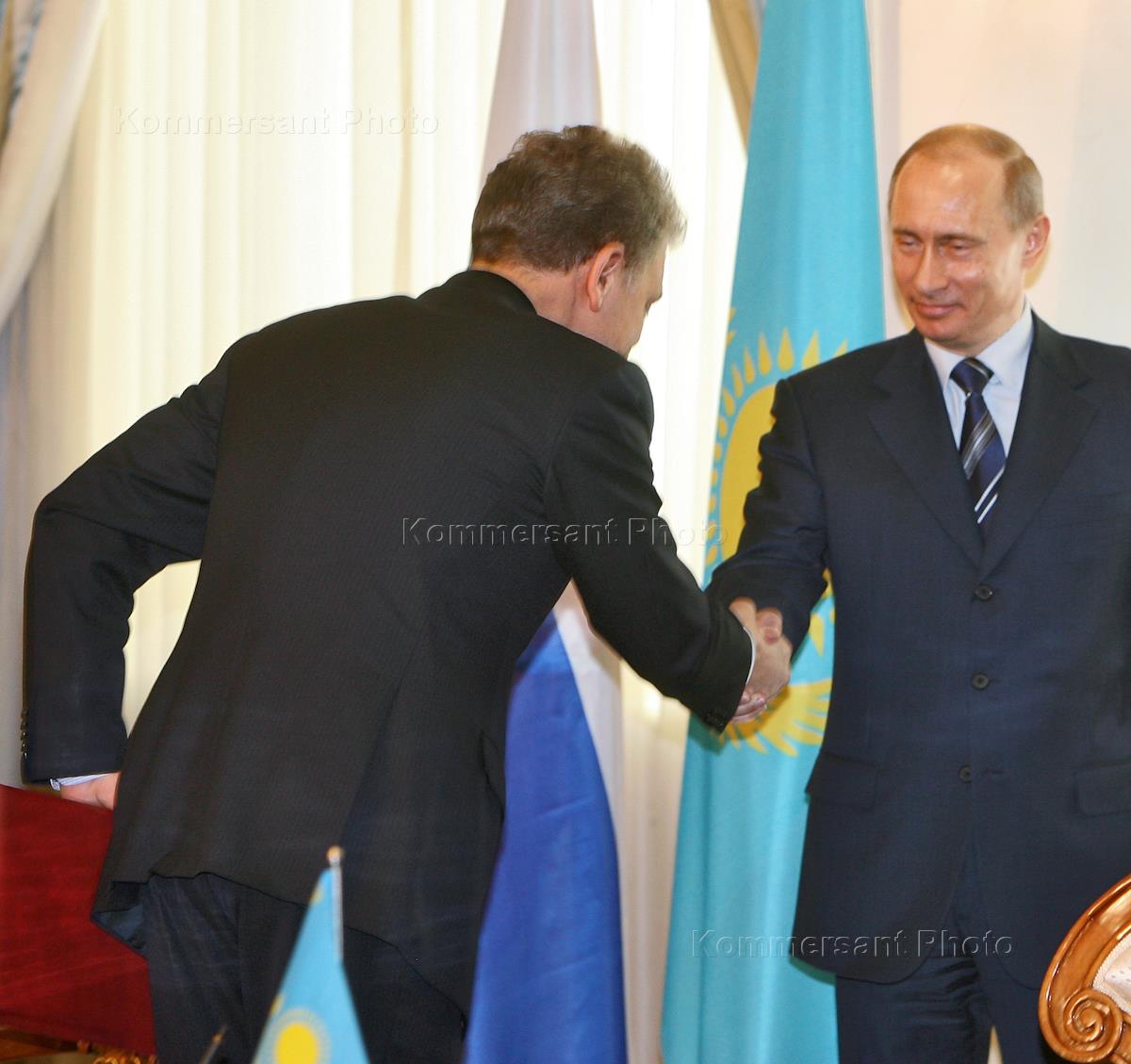 Tatarstan President Mintimer Shaymiyev, right, attends the meeting of Russian President Vladimir Putin and Kazakhstan President Nursultan Nazarbayev in Astana.